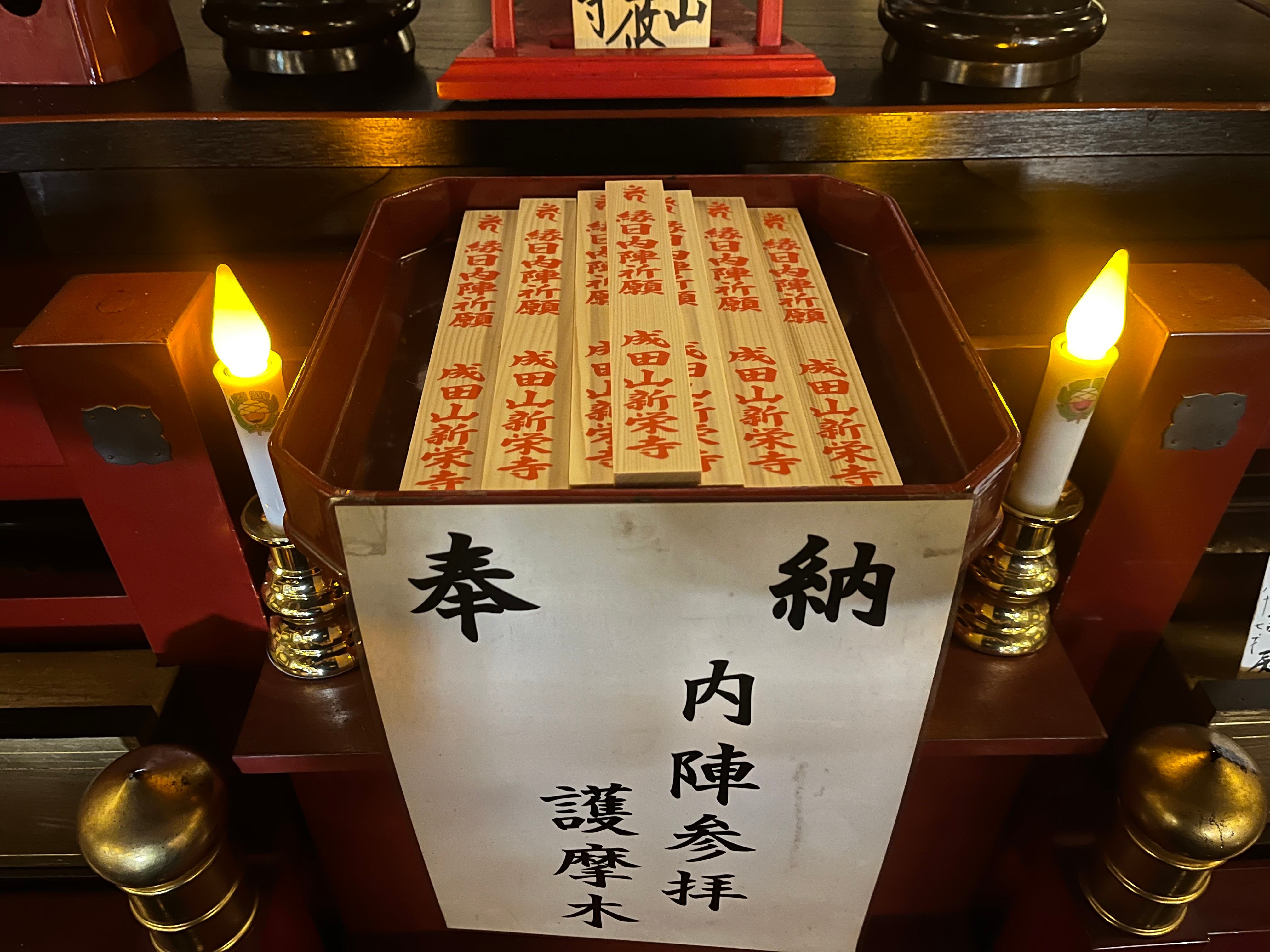 不動明王様の正面まで来ましたら、お持ちの内陣参拝特別護摩木をこちらの三宝(さんぽう)にお納めください。