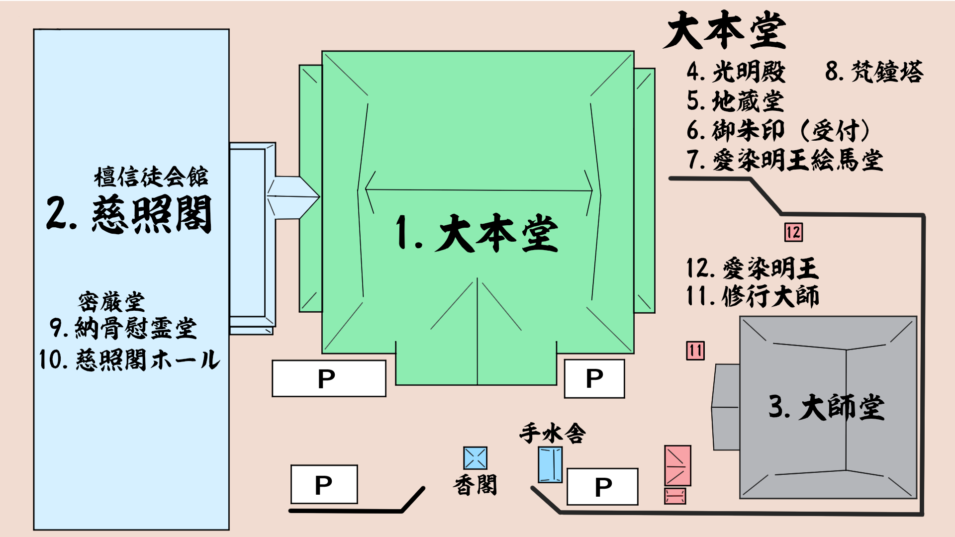 愛染明王をご本尊として、縁結びの特別な絵馬に願いを込め奉安できる絵馬堂です。絵馬は慈照閣ホールにございます。貝殻でできたハート形特別にご用意した當山だけの珍しいものとなっております。どうぞご参拝下さい。